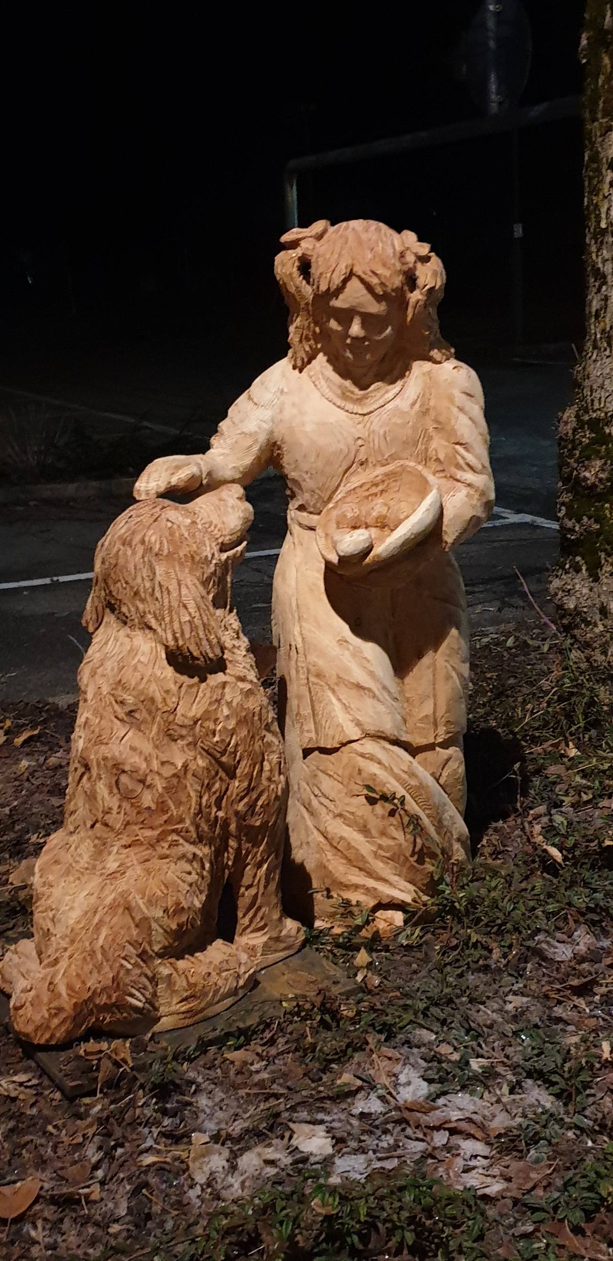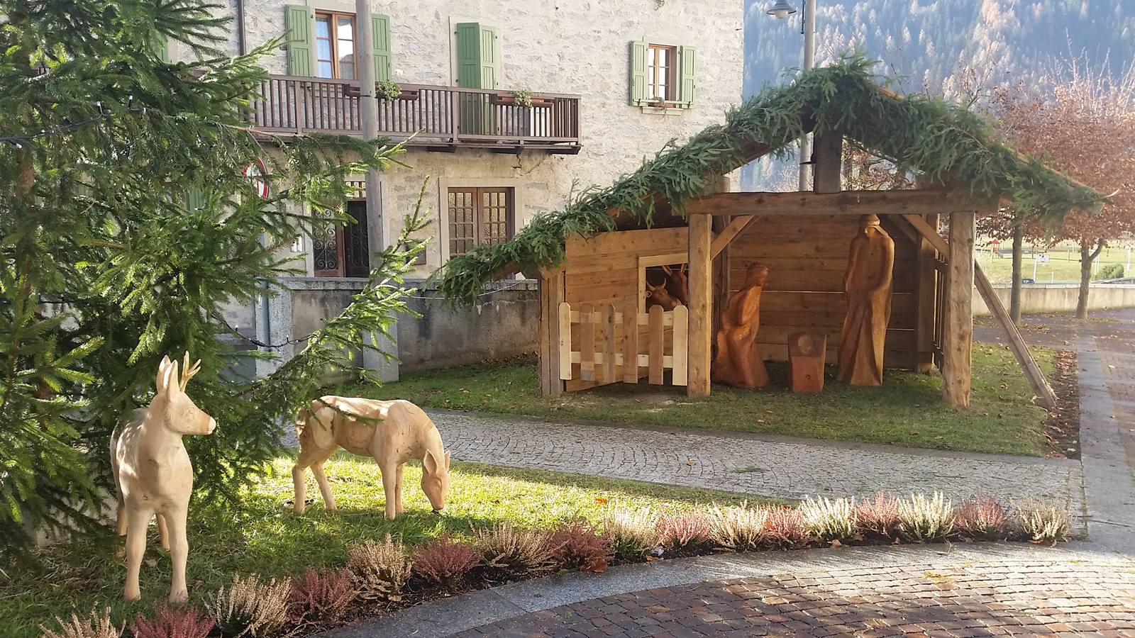 Tutto è iniziato nel 2013, a dire il vero, quando l’assessore alla cultura Carmen Turri organizzò un simposio con gli scultori dell'Associazione La Büsier di Praso per offrire alla Comunità di Giustino una bella Natività a grandezza naturale, in legno, da mettere vicino all'albero per il Natale. Qualche pecora e un paio di caprioli furono aggiunti successivamente e poi lo scorso anno, a fine ottobre, arrivò la tempesta Vaia ad abbattersi sul Trentino e sui boschi di Giustino e un'idea prese forma. Usare il legno degli schianti per fare delle nuove statue che portassero con sé il significato più profondo del Natale, al di là del consumismo dei regali. Così è nato il presepe diffuso di Giustino che oggi ammanta il paese della val Rendena dell'atmosfera soffusa del Natale. Il pastore, il bimbo con flauto, la madre e la figlia, la bimba accompagnata dal suo cane per citare solo alcune delle sculture che si trovano, accolgono la Comunità in un percorso ideale che conduce al sagrato della chiesa parrocchiale.