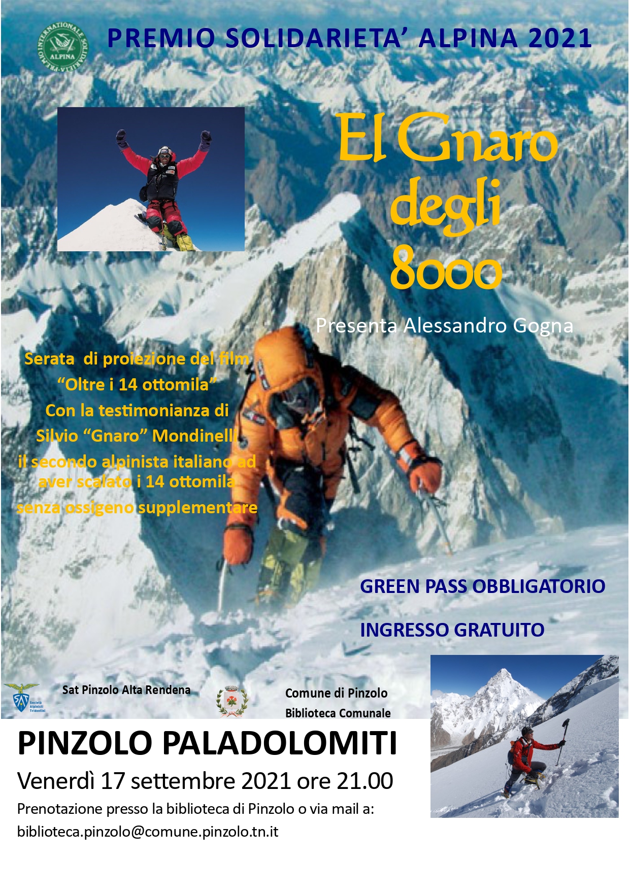 Venerdì sera, al Paladolomiti, ore 21.00, serata pubblica con Silvio Mondinelli che commenterà la proiezione del film "Oltre i 14 Ottomila" (ingresso gratuito con obbligo di green pass e prenotazione presso la Biblioteca di Pinzolo, This email address is being protected from spambots. You need JavaScript enabled to view it.">This email address is being protected from spambots. You need JavaScript enabled to view it.). Al mattino incontrerà gli alunni dell'Istituto Comprensivo Val Rendena.