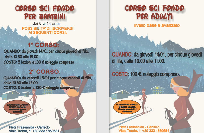 Alla pista “Frassanida” di Carisolo sono offerti corsi di sci sia per bambini che per adulti. Le iscrizioni vengono raccolte presso l'ufficio Pro Loco di Carisolo (Via Verdi, 24) entro martedì 12 gennaio 2021.