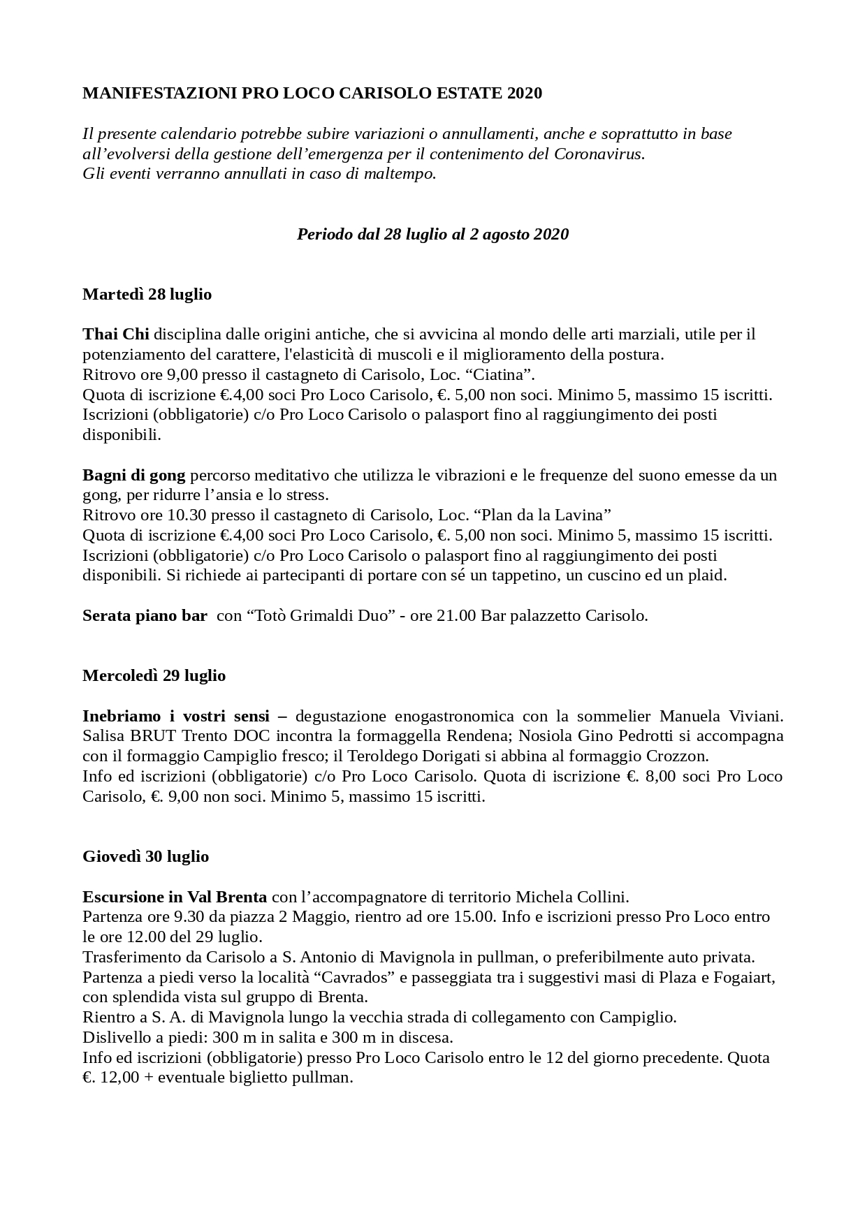 Arriva il calendario dettagliato delle attività in programma per l'estate 2020 a Carisolo; come precisato, possibili saranno delle modifiche, anche considerata l'emergenza Covid-19.
