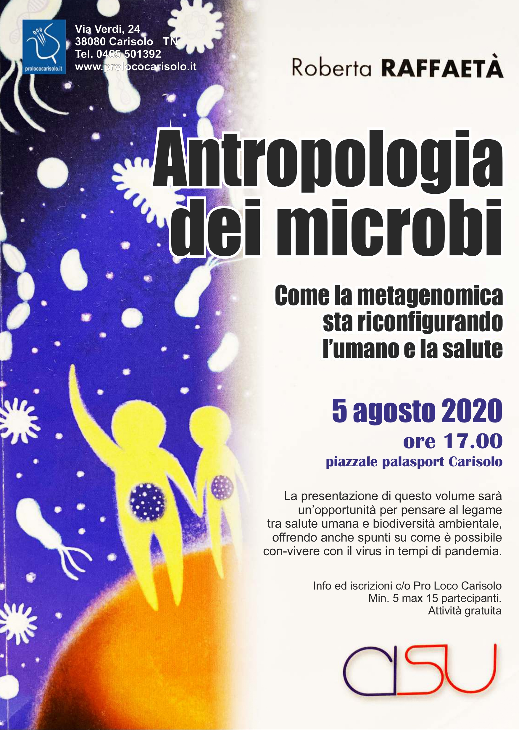 Mercoledì 5 agosto presentazione del libro “Antropologia dei microbi” di Raffaetà, antropologa culturale; ore 17.00 presso il piazzale palasport. Il libro cade a pennello di questi tempi: è un viaggio nel mondo microbico che esiste intorno, sopra e dentro di noi, un viaggio verso la conoscenza del 'microbioma', necessario per la nostra salute.