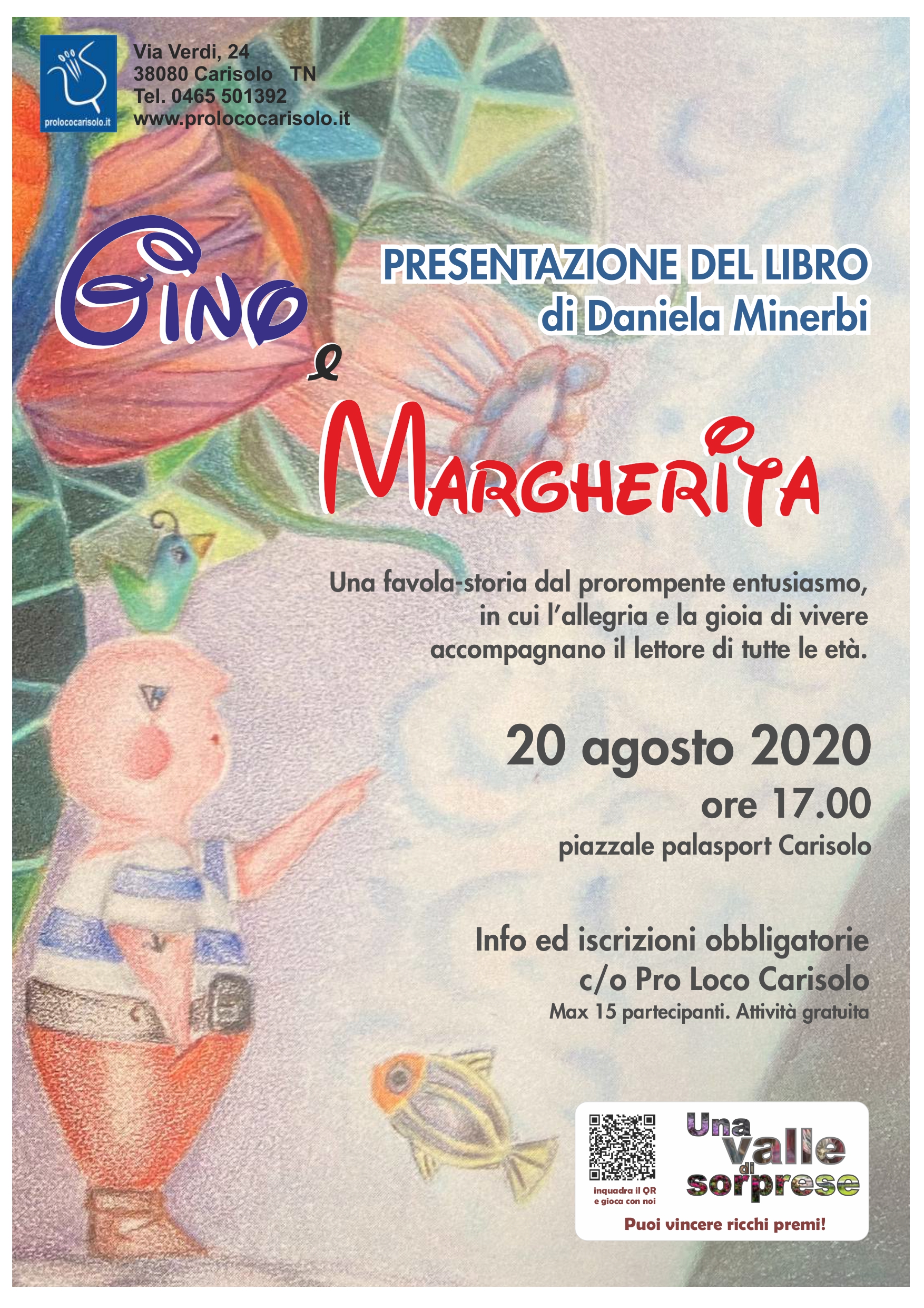 CARISOLO. La Pro Loco di Carisolo promuove la presentazione del libro “Gino e Margherita” dell’artista Daniela Minerbi. Una “favola-storia”, così definita dall'autrice, in cui l’allegria e la gioia di vivere accompagnano il lettore di tutte le età. «Il felice incontro dei due personaggi protagonisti- ci dice l'autrice - vuole trasmettere un sinergismo di voglia di vivere, una condivisione di esperienze uniche e positive».