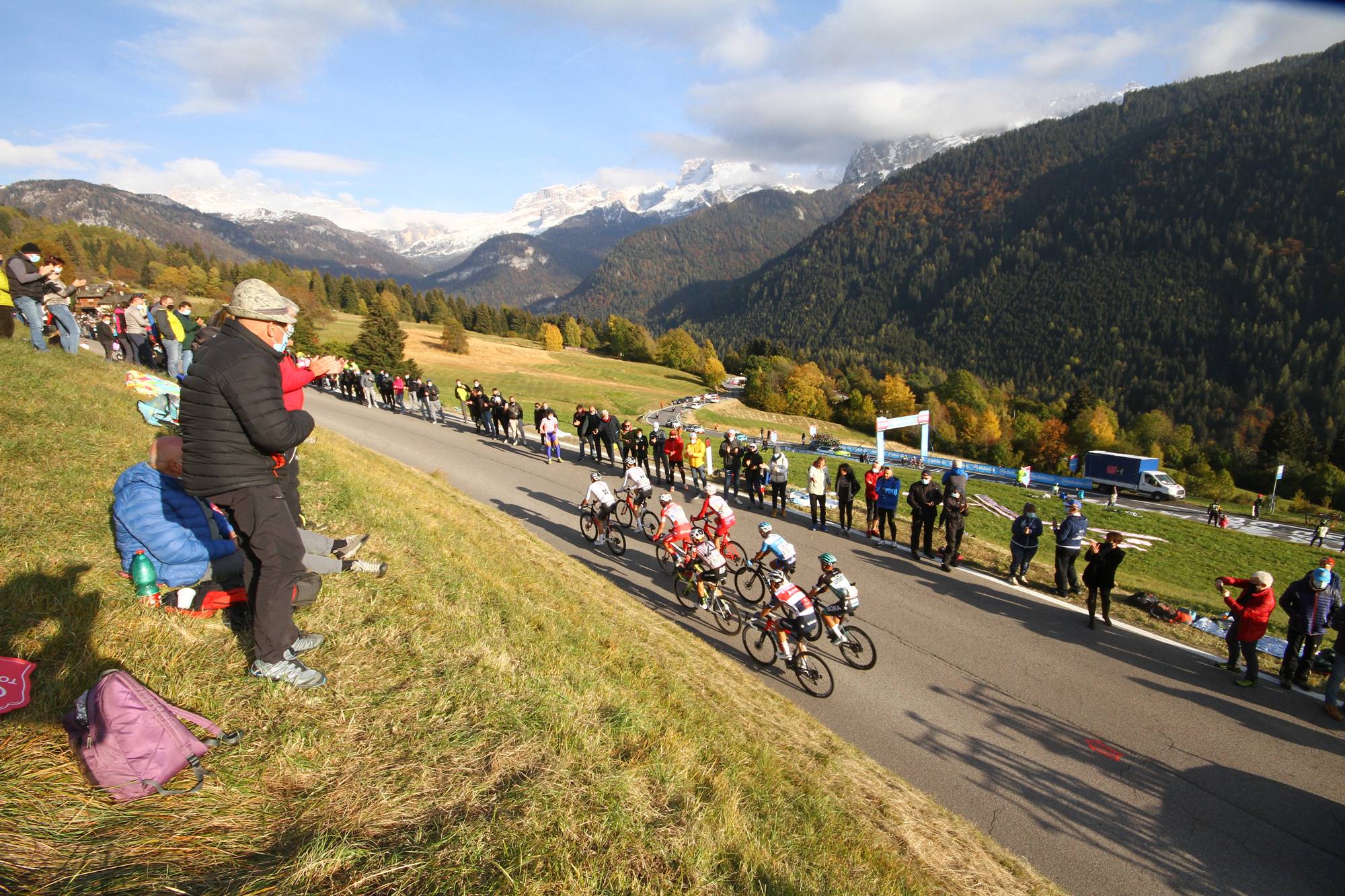Salendo, lungo i tornanti che portano a Madonna di Campiglio, numerosissimi i tifosi e gli appassionati distribuiti lungo la strada. Tanti i messaggi visibili dedicati a Marco Pantani e scenografico il saluto proposta dalla Dolomitica Brenta Bike (prossima edizione 27 giugno 2021).