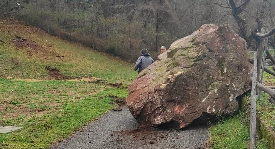 BORGO CHIESE. Un masso di enormi dimensioni sì è staccato dal versante sottostante l'abitato di Brione: è successo nel pomeriggio di ieri, sabato 2 aprile. La strada di accesso alla frazione è stata chiusa.