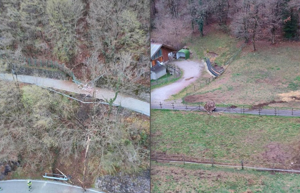 Il masso è rotolato a gran velocità, attraversando due volte la strada e rompendo le infrastrutture di contenimento. Ha finito la sua corsa non troppo distante da un edificio. Le immagini scattate dall'elicottero della Pat rendono la massa del considerevole pezzo di roccia e la pericolosità dell'evento.